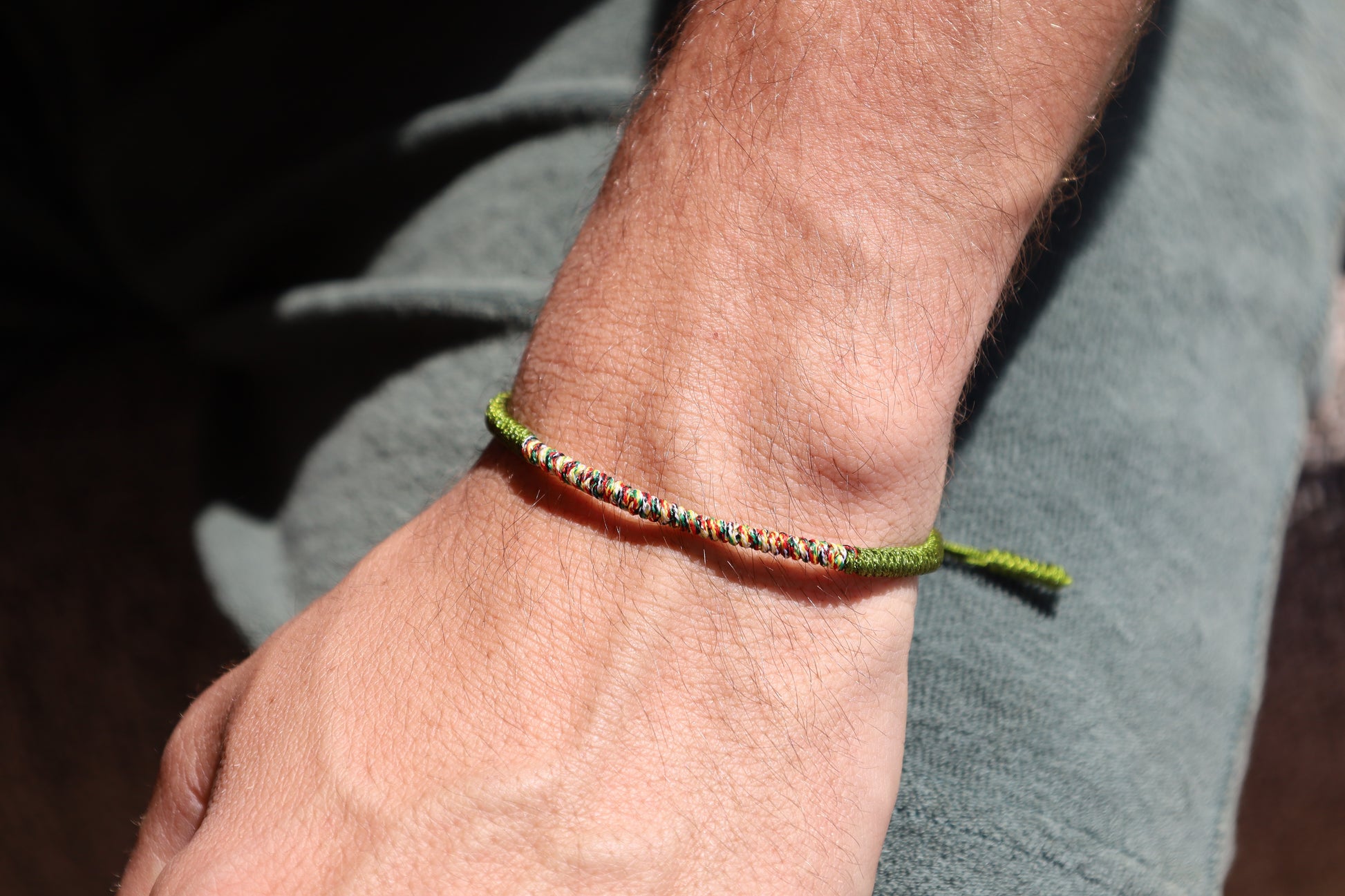 Bracelet homme tressé rond vert vif et touches multicolores.