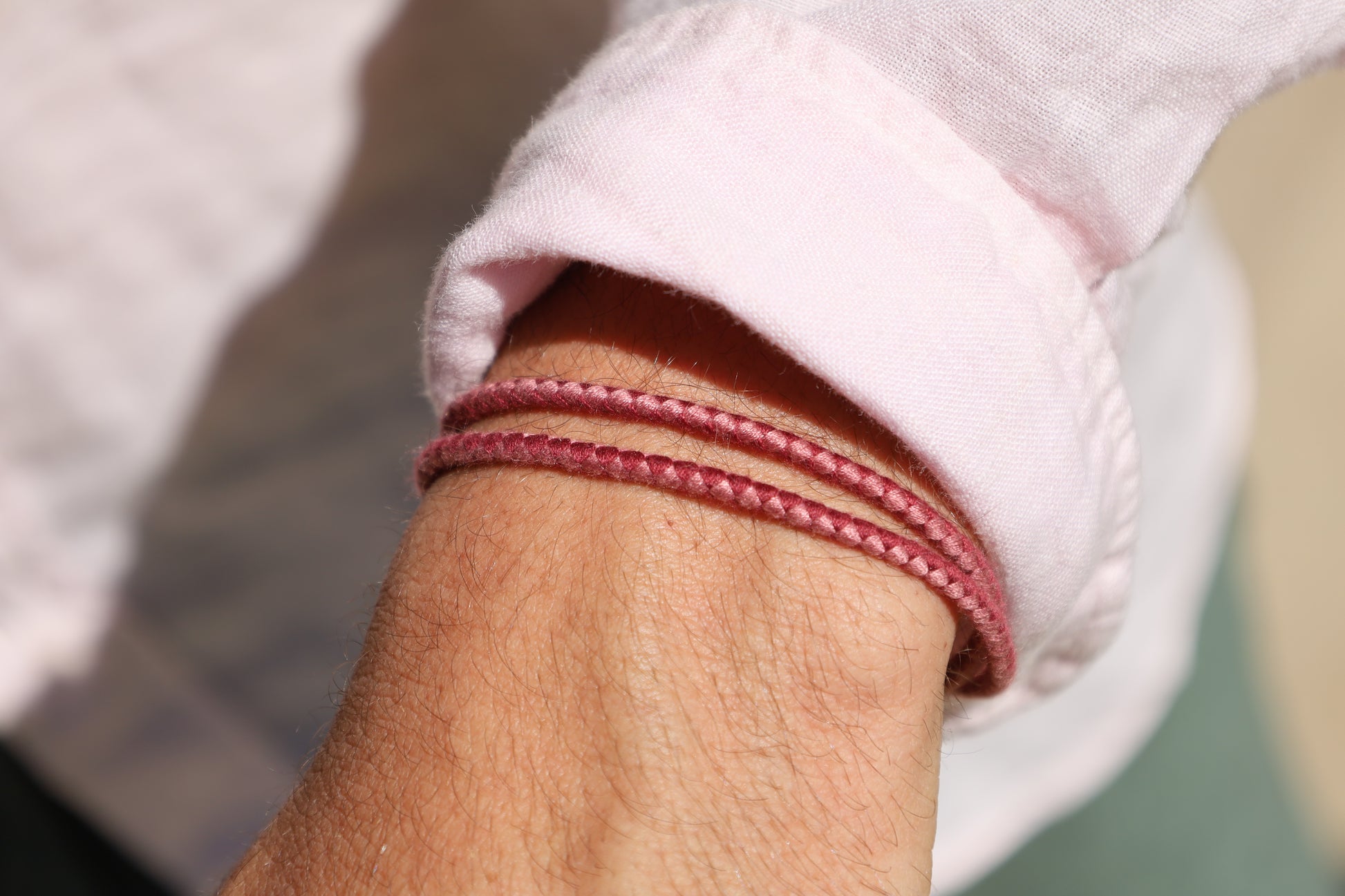 Bracelet homme corde tressée dans les tons vieux rose et framboise.
