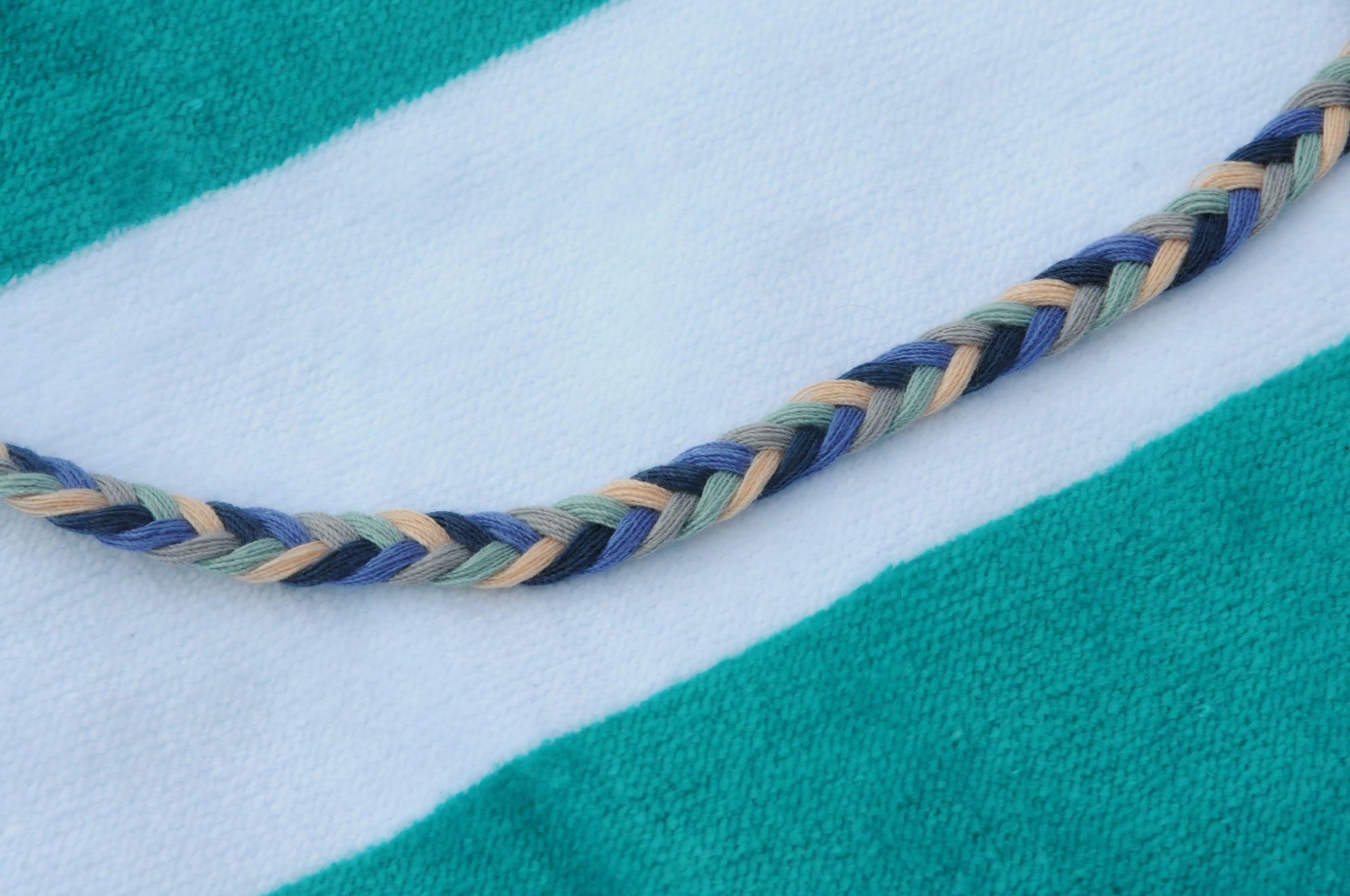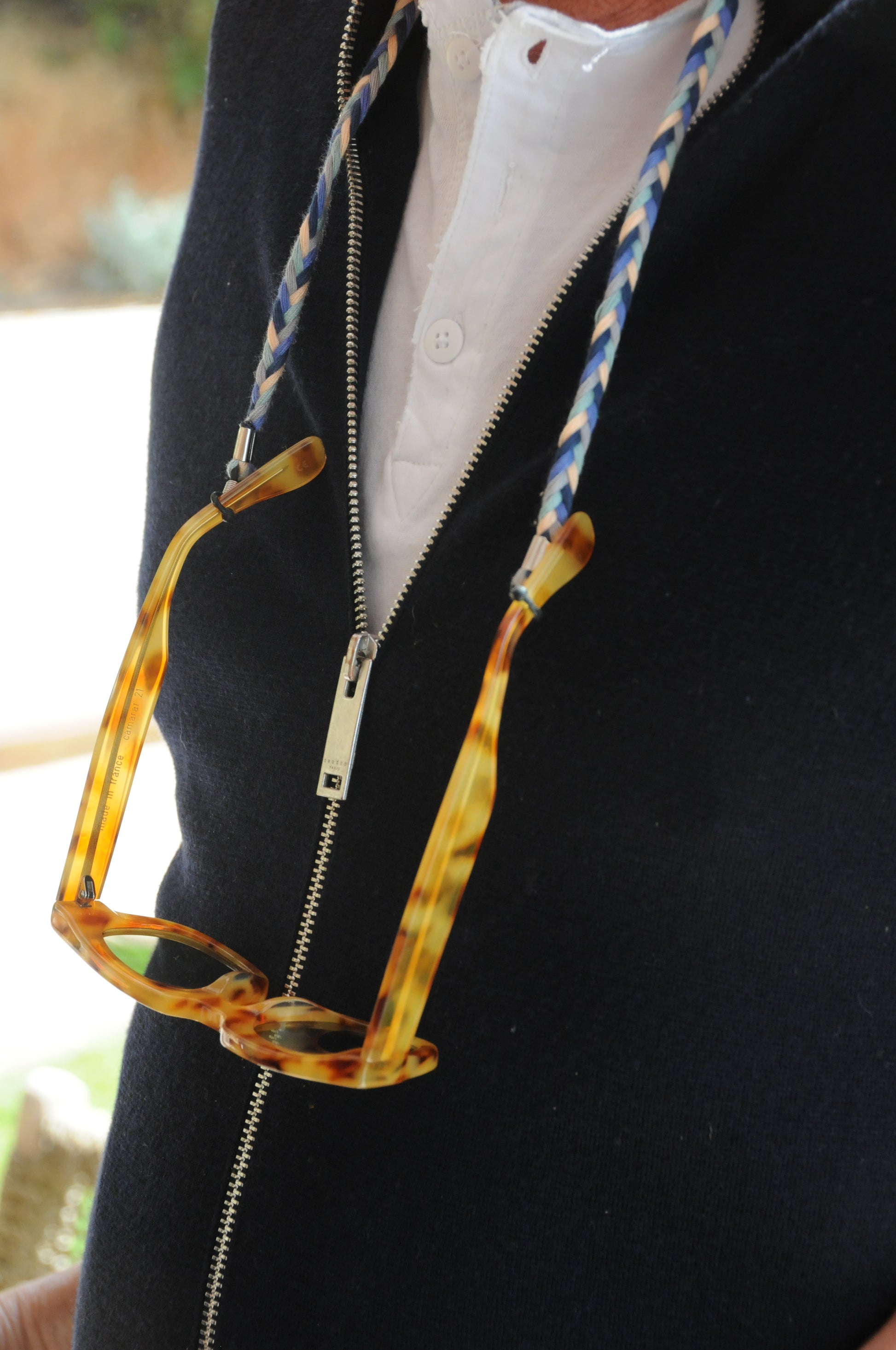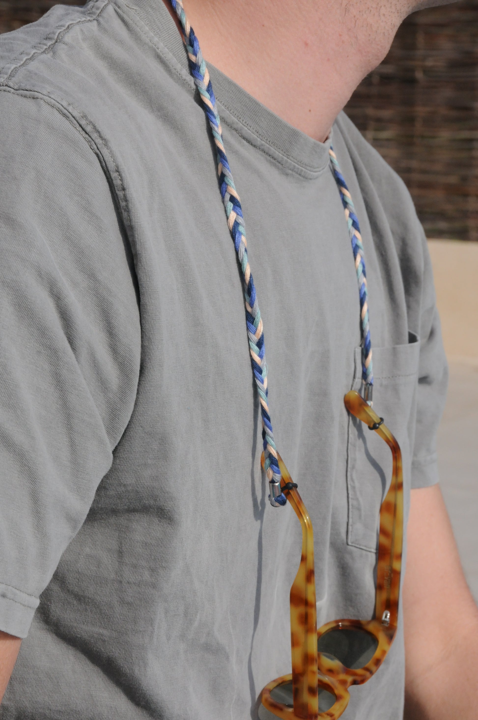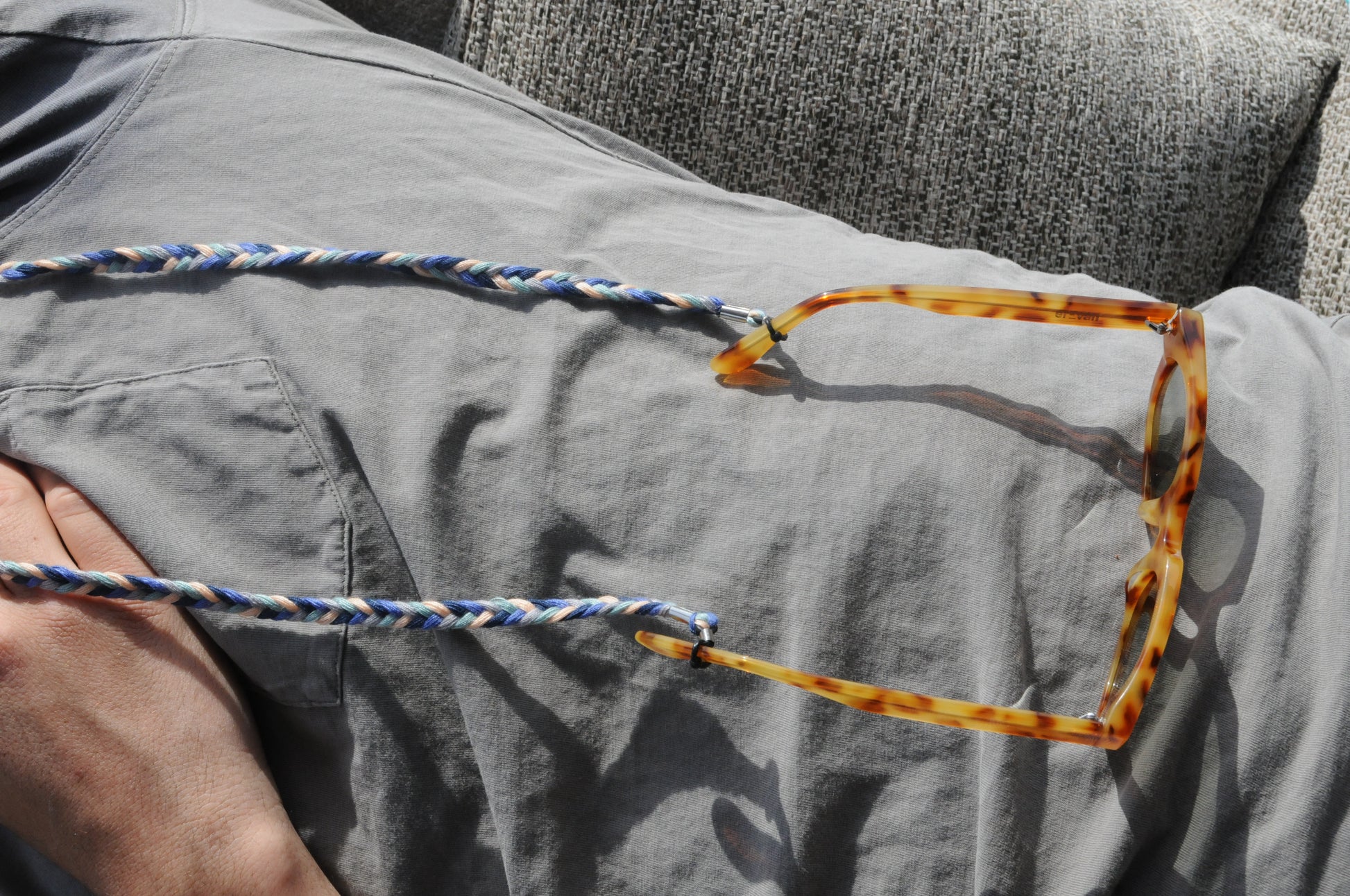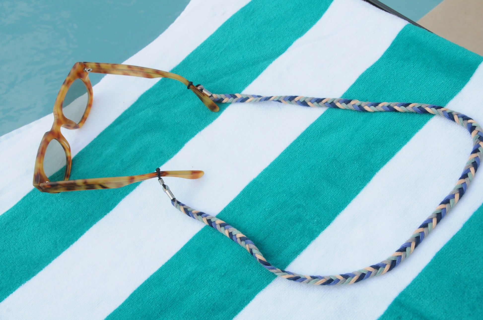 Bracelet de lunettes Echeveria tressé avec différentes nuances de bleu et une touche crème. La touche finale d'un look Sauvage au soleil ☀️ À assortir avec le bracelet Lierre pour un total look !