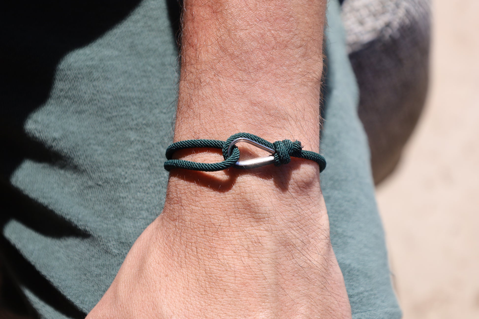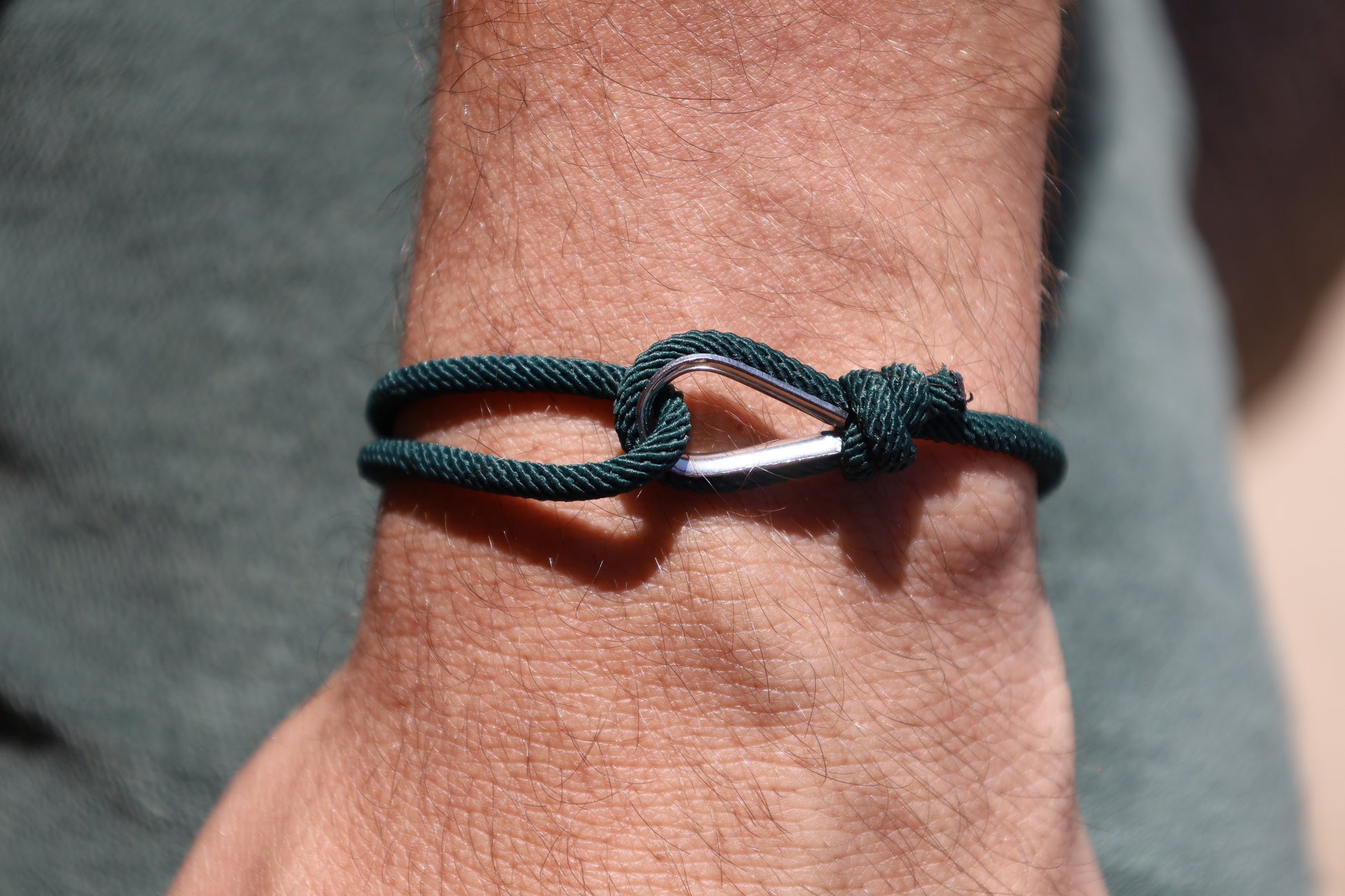 Bracelet homme lien épais vert forêt avec pendentif argent.