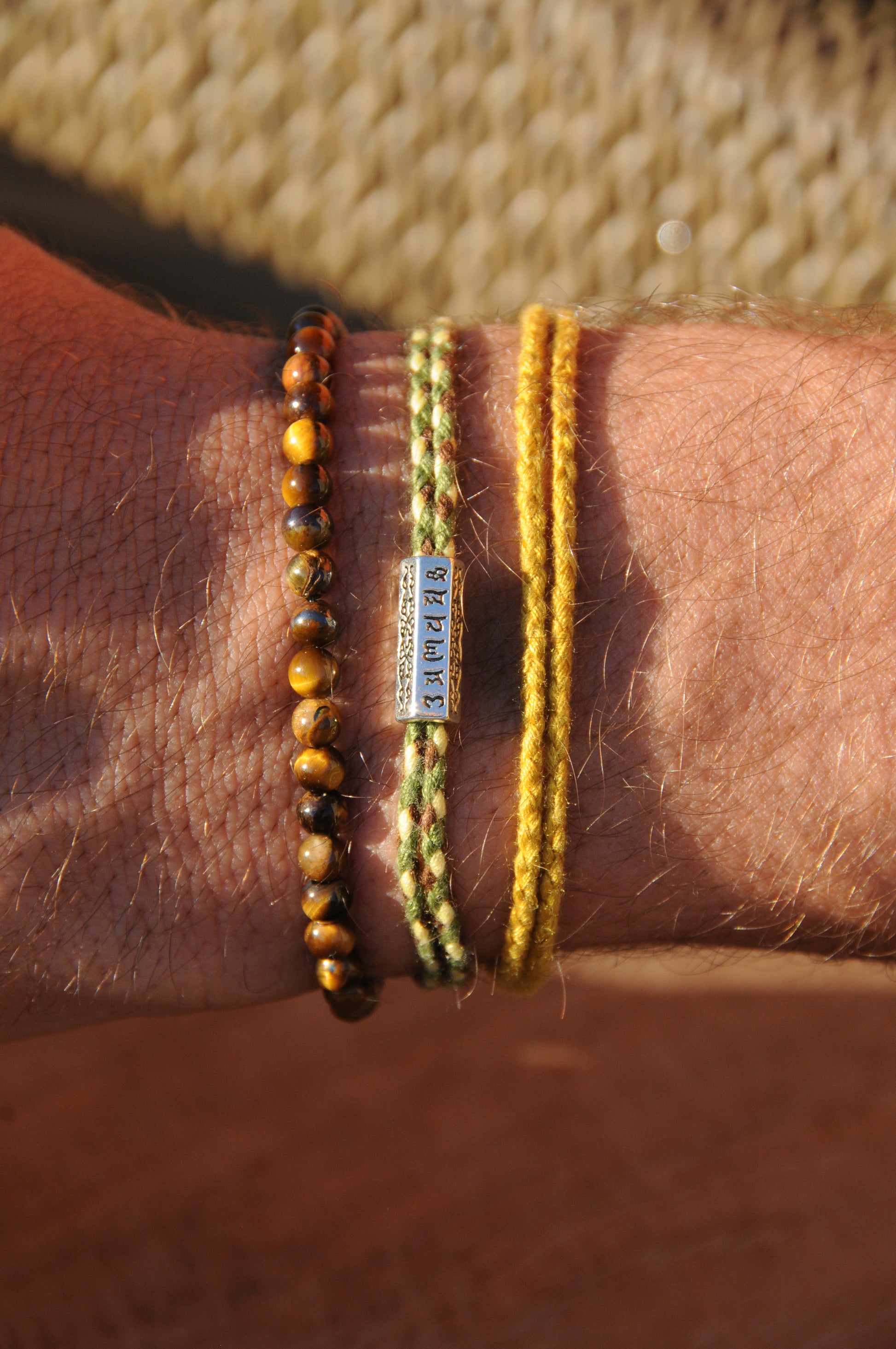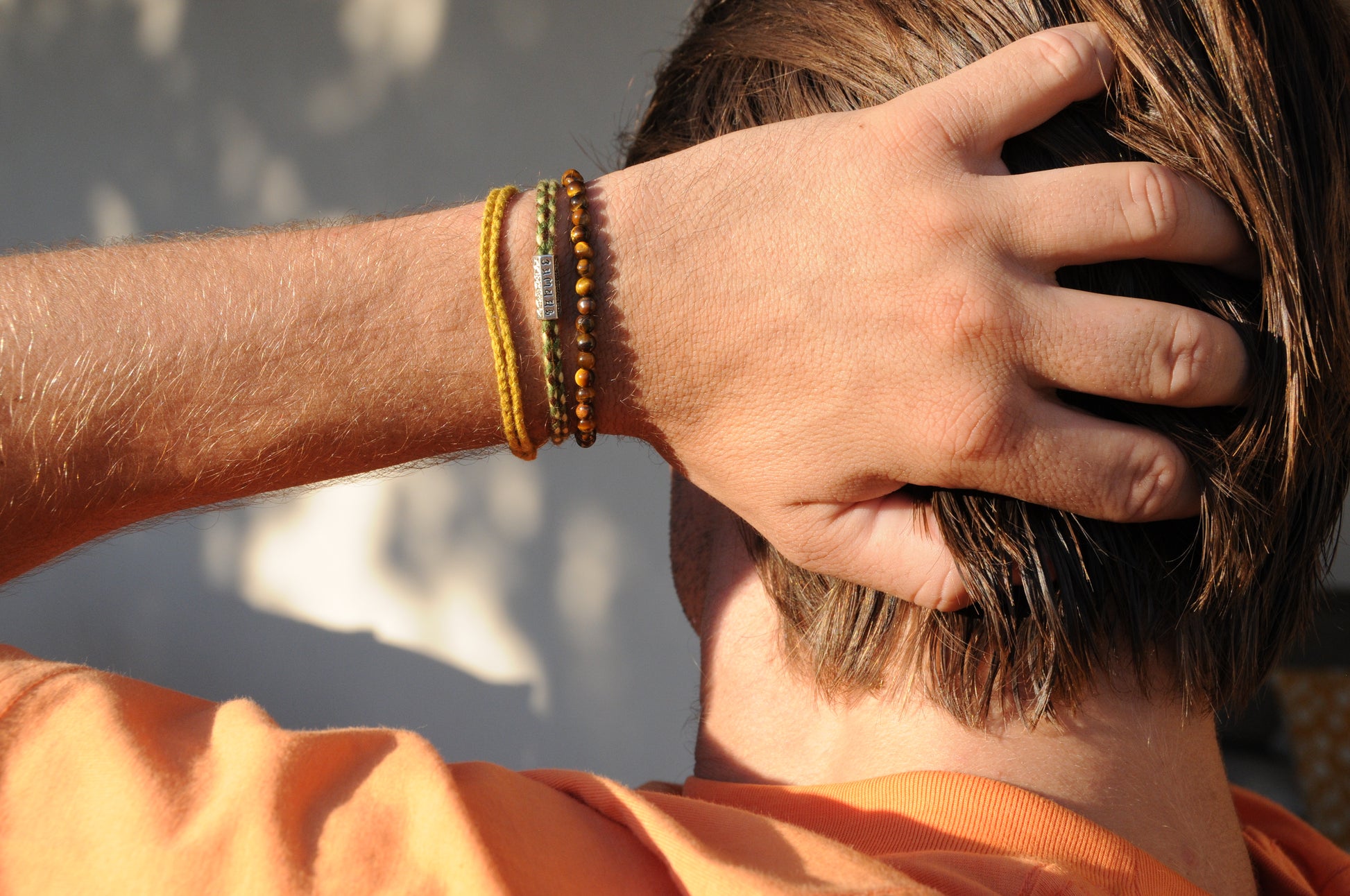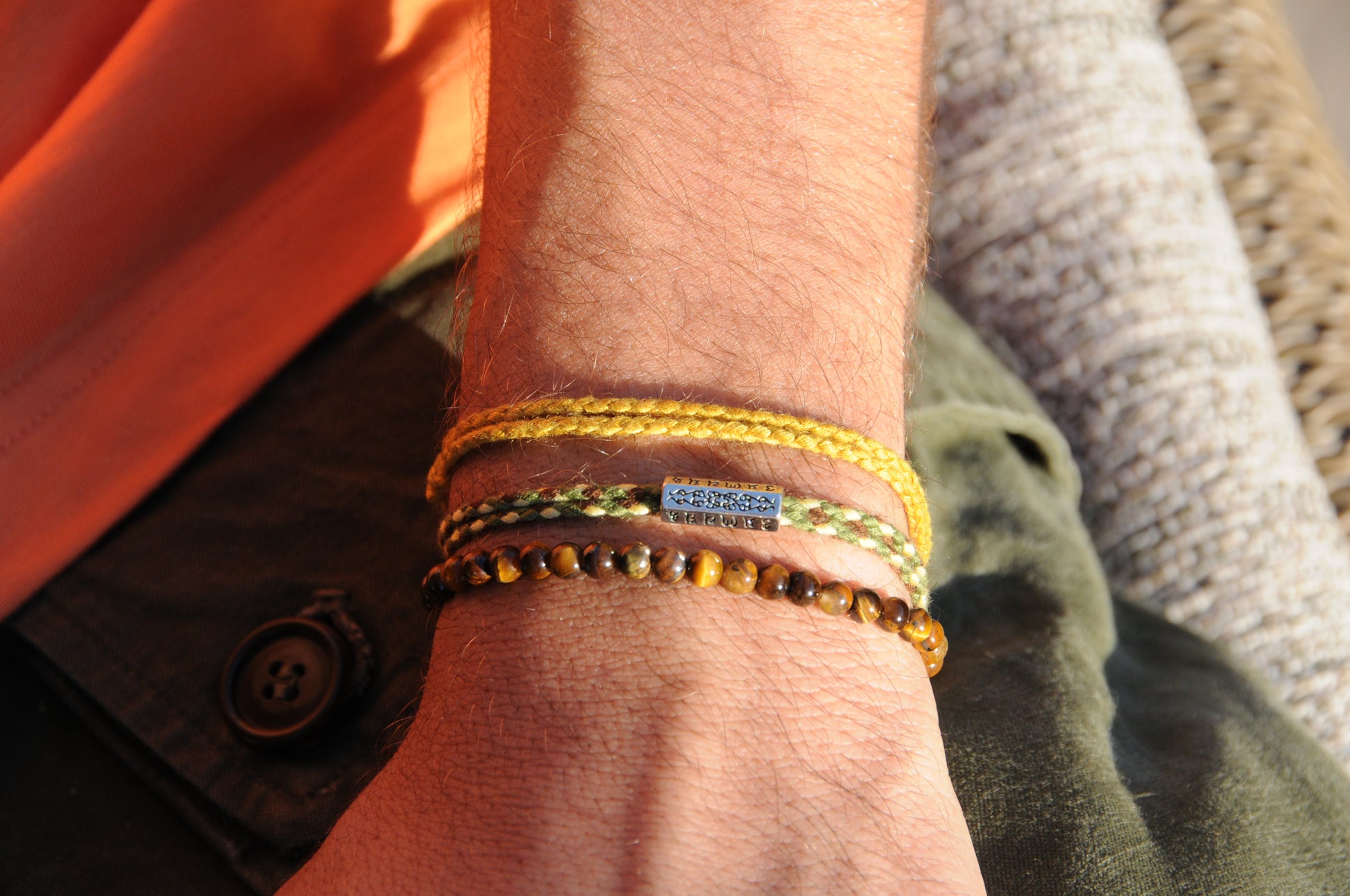 Bracelet homme liens tressés marron, jaune, kaki avec breloque argent.