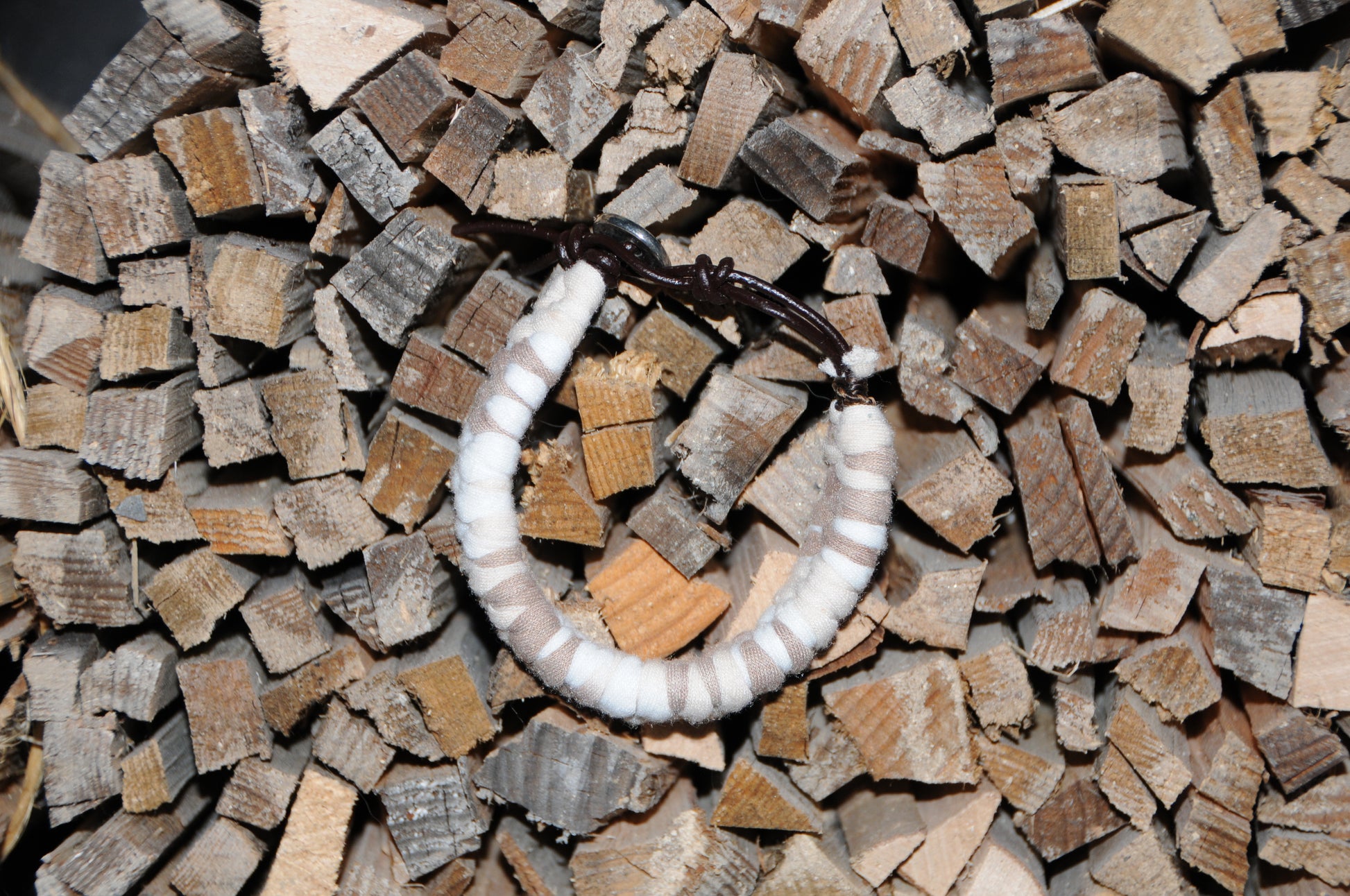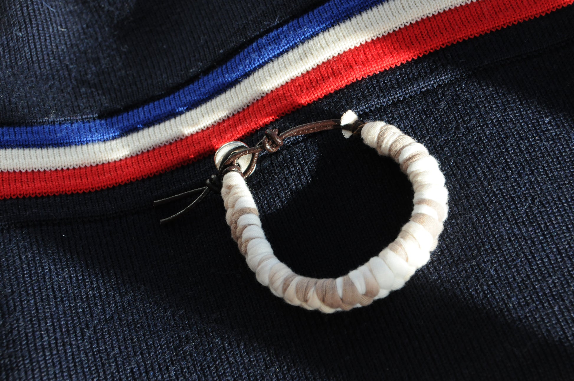 Bracelet épais tissé en tissu blanc et beige avec cordon cuir.
