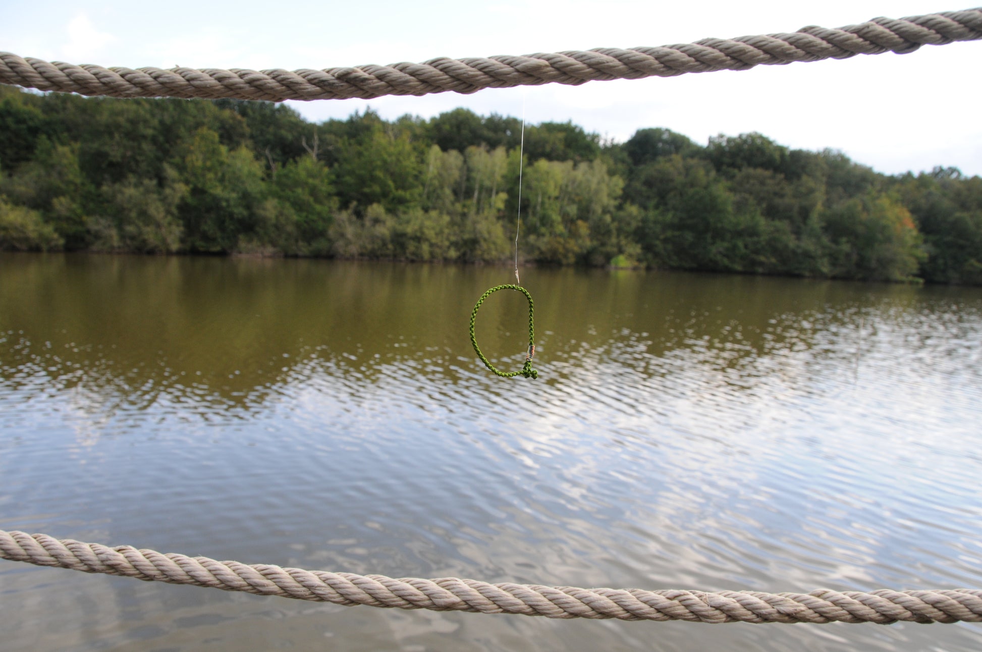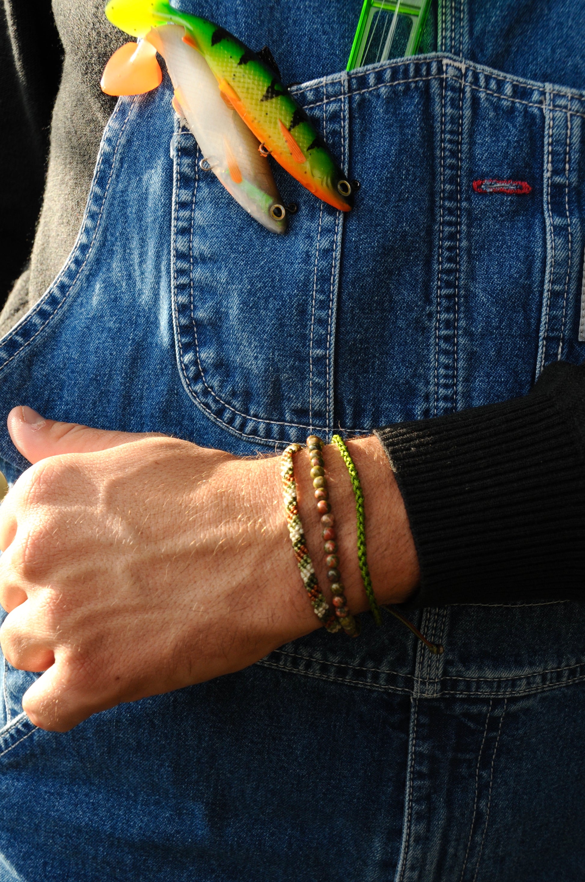 Bracelet homme en corde tressée kaki avec touches multicolores.