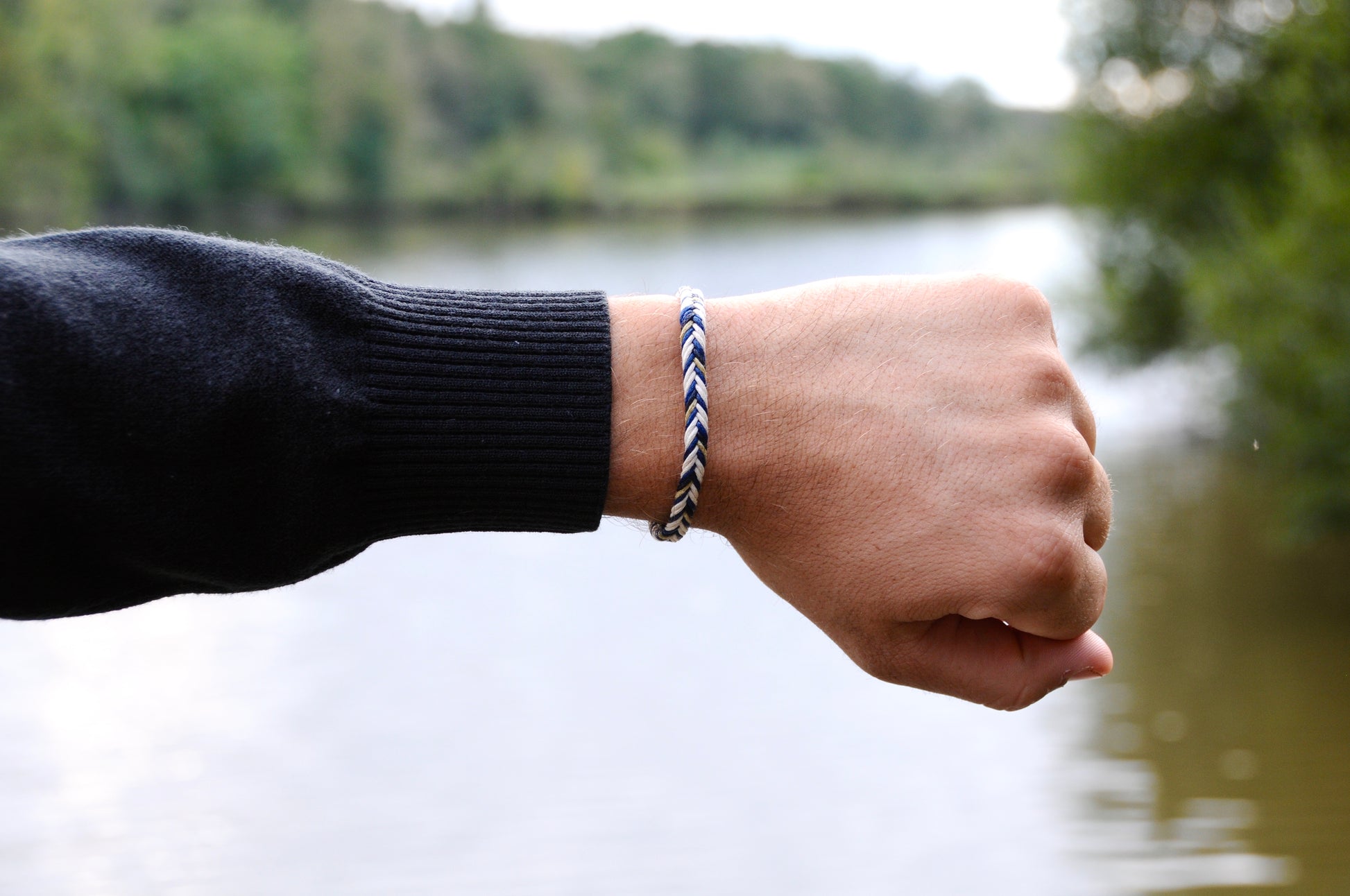 Bracelet homme cordes tressées blanc cassé et bleu marine.