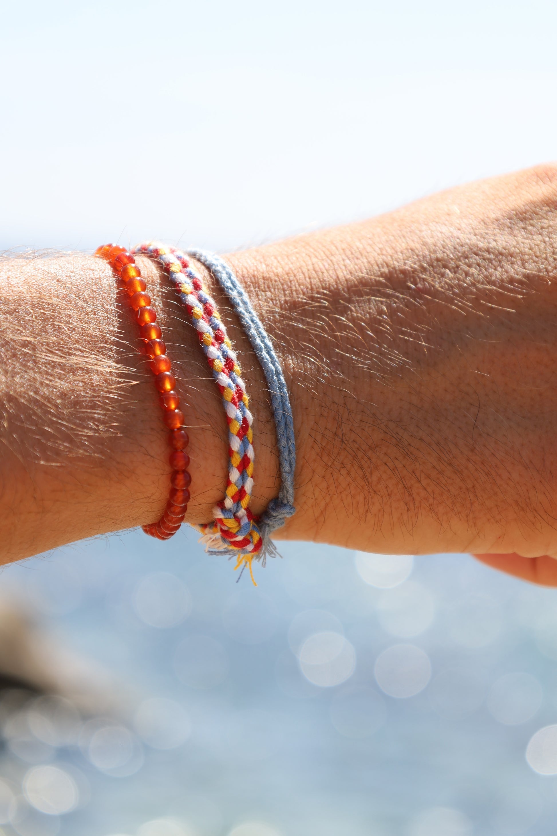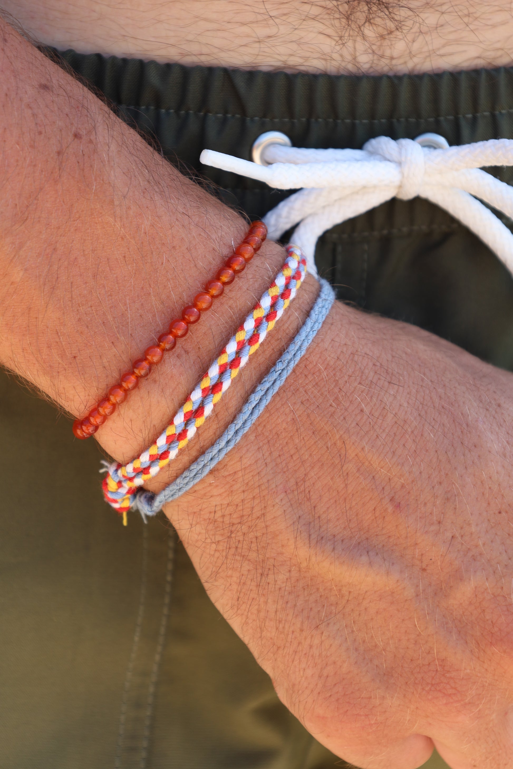 - Manettia : un bracelet cordes tressées blanc, moutarde, rouge et bleu gris