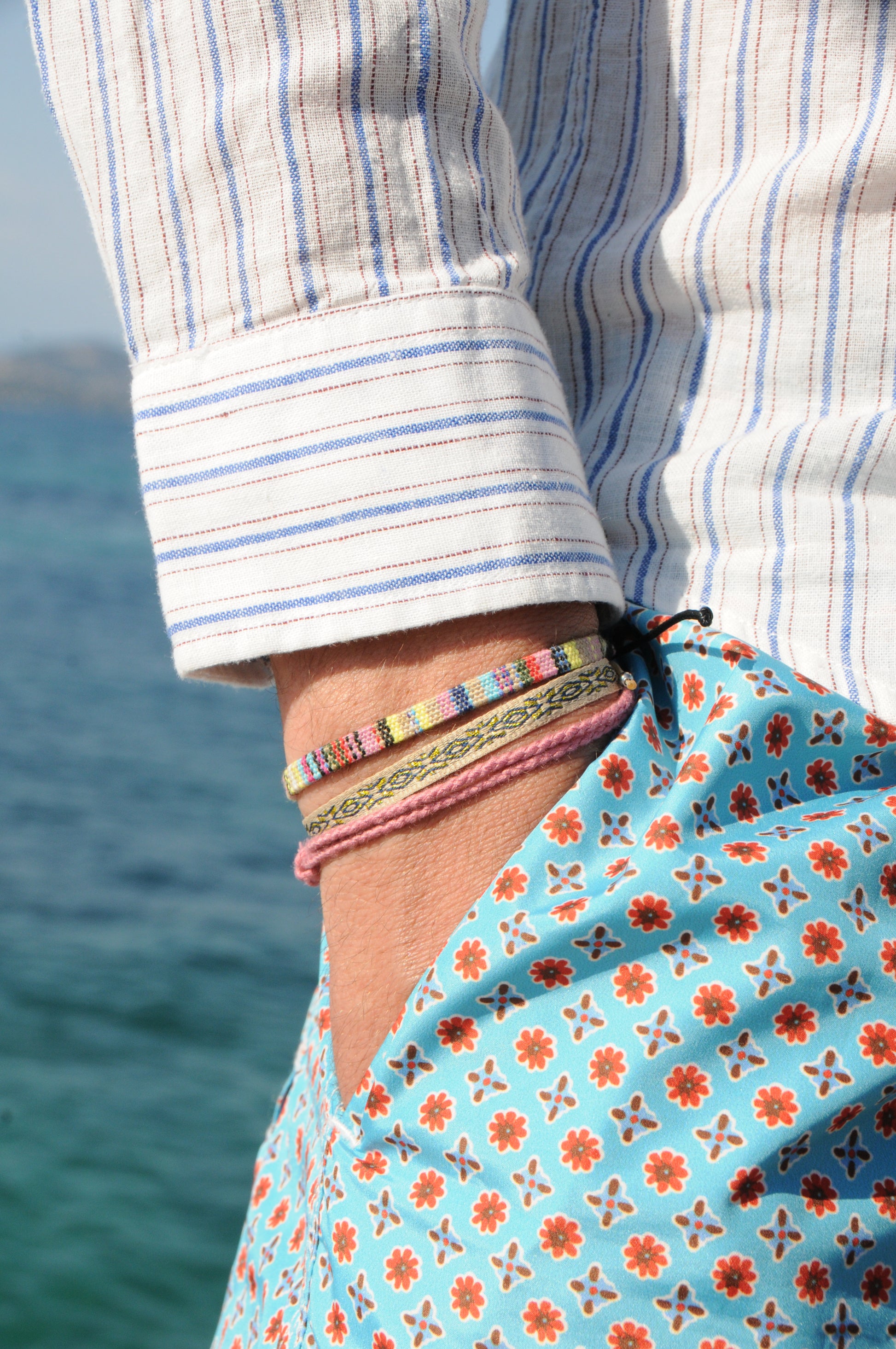 - Ortie, un bracelet imprimé ethnique beige avec touches de bleu marine et de doré.