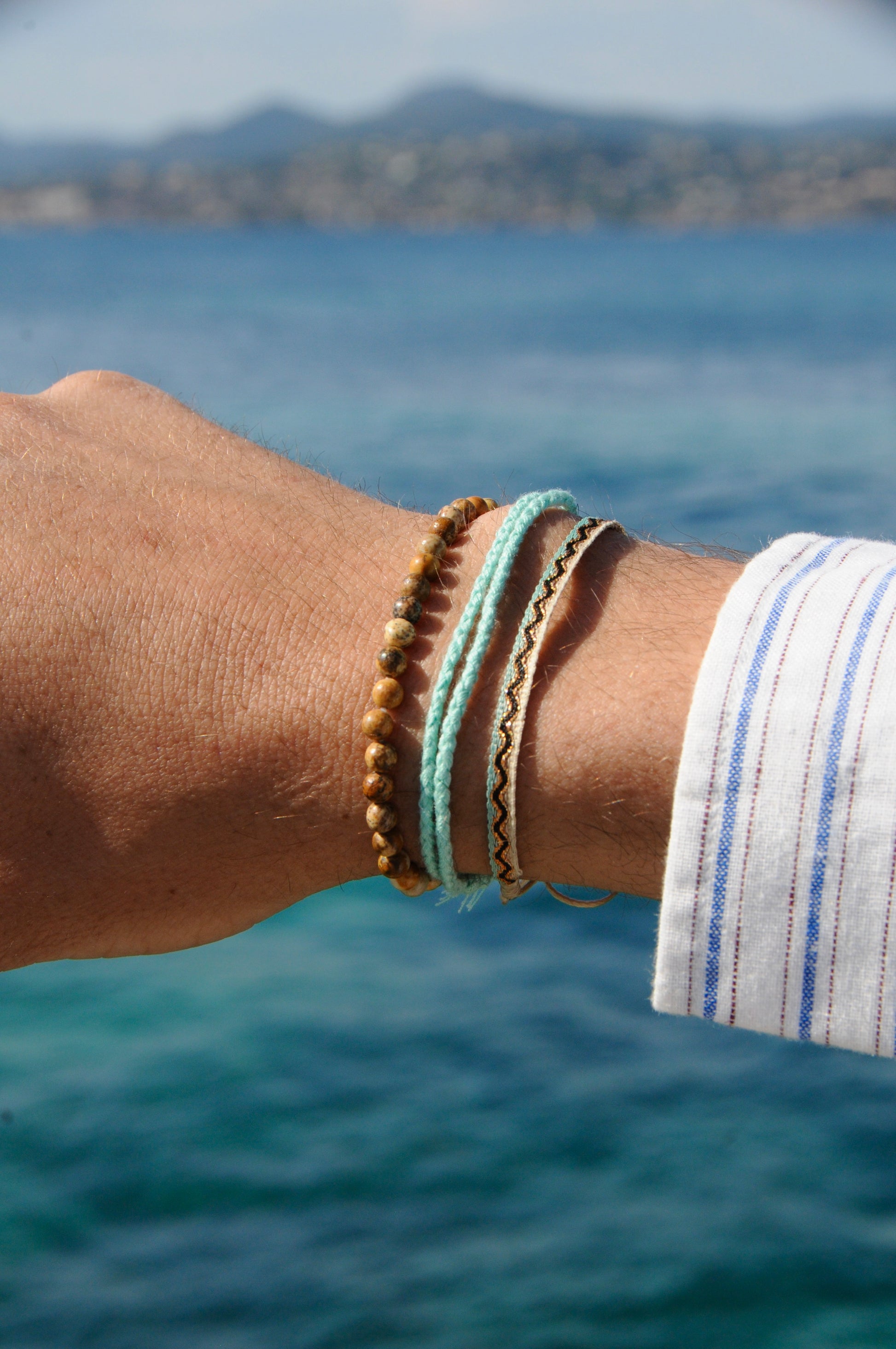 - Basilic, un bracelet imprimé vague beige, bleu avec ligne noire et détails cuivre.